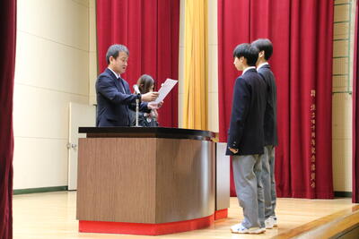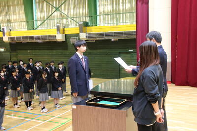全校集会に先立ち、吹奏楽部、検定合格者、陸上部の表彰伝達が行われました。