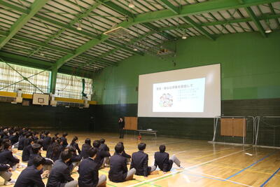 参加した中学生と保護者は全員体育館に集められ、本校生徒会生徒による学校行事等の説明、担当教員からの本校の特色ある教育活動について説明を受けました。